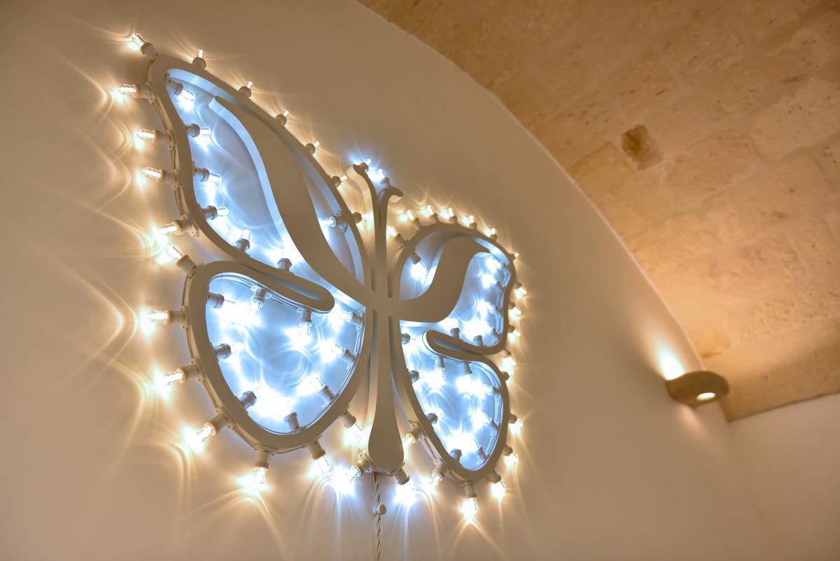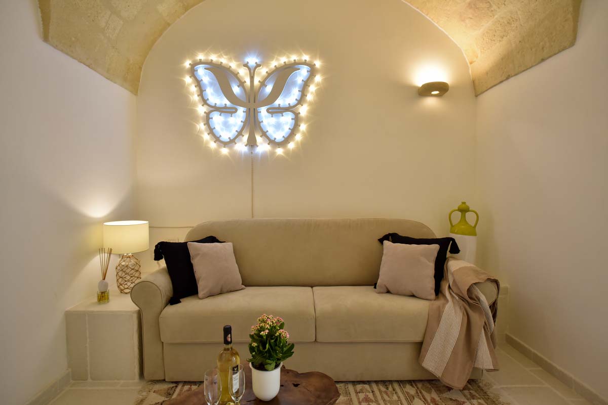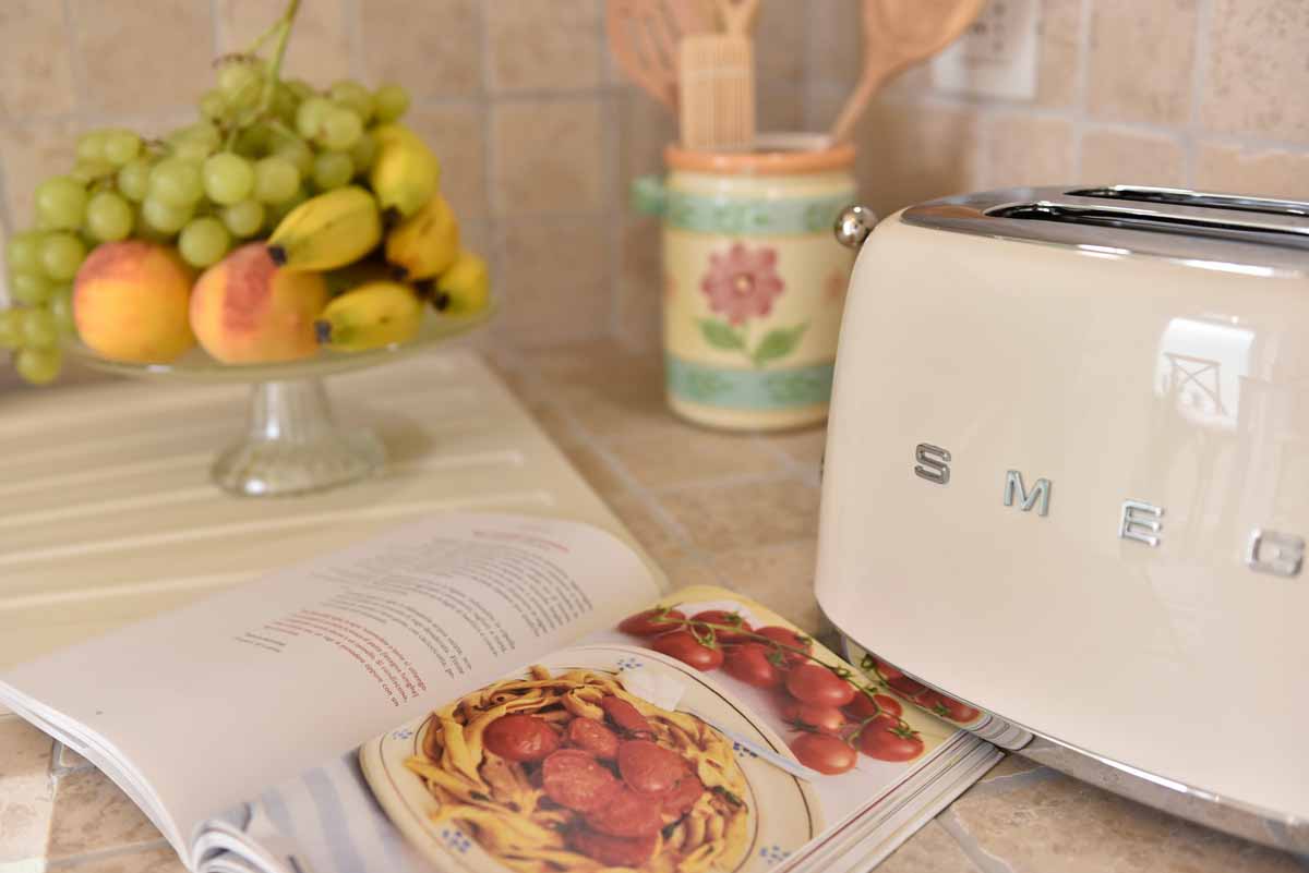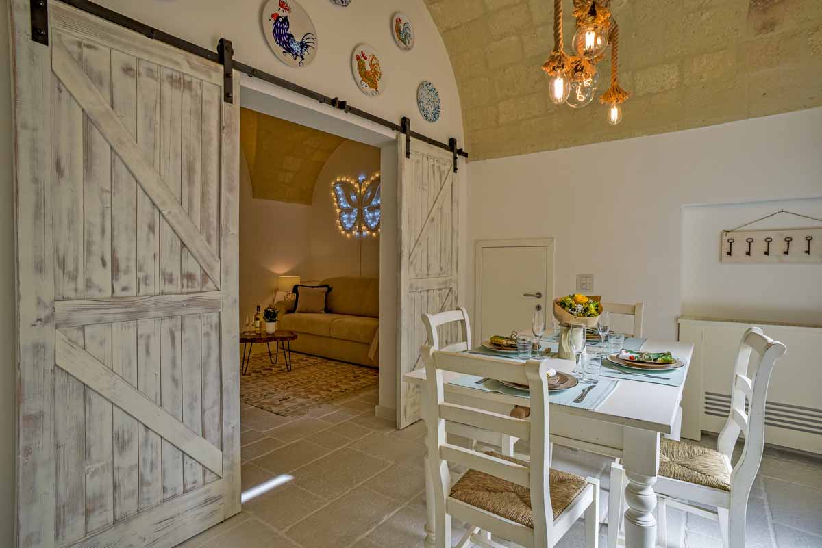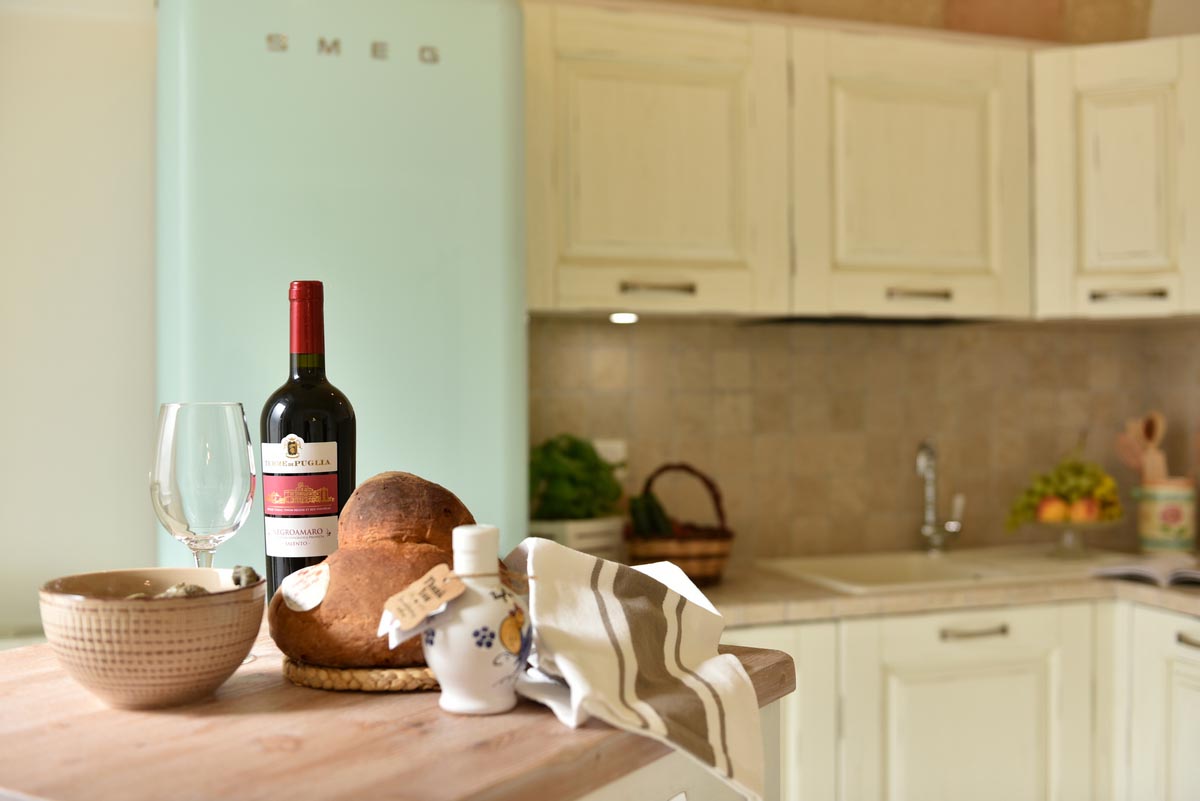 Ad impreziosire gli spazi gli elettrodomestici dal chiaro richiamo retrò, gli accessori per la tavola e alle pareti i tipici piatti in ceramica con i simboli della Puglia più autentica.
