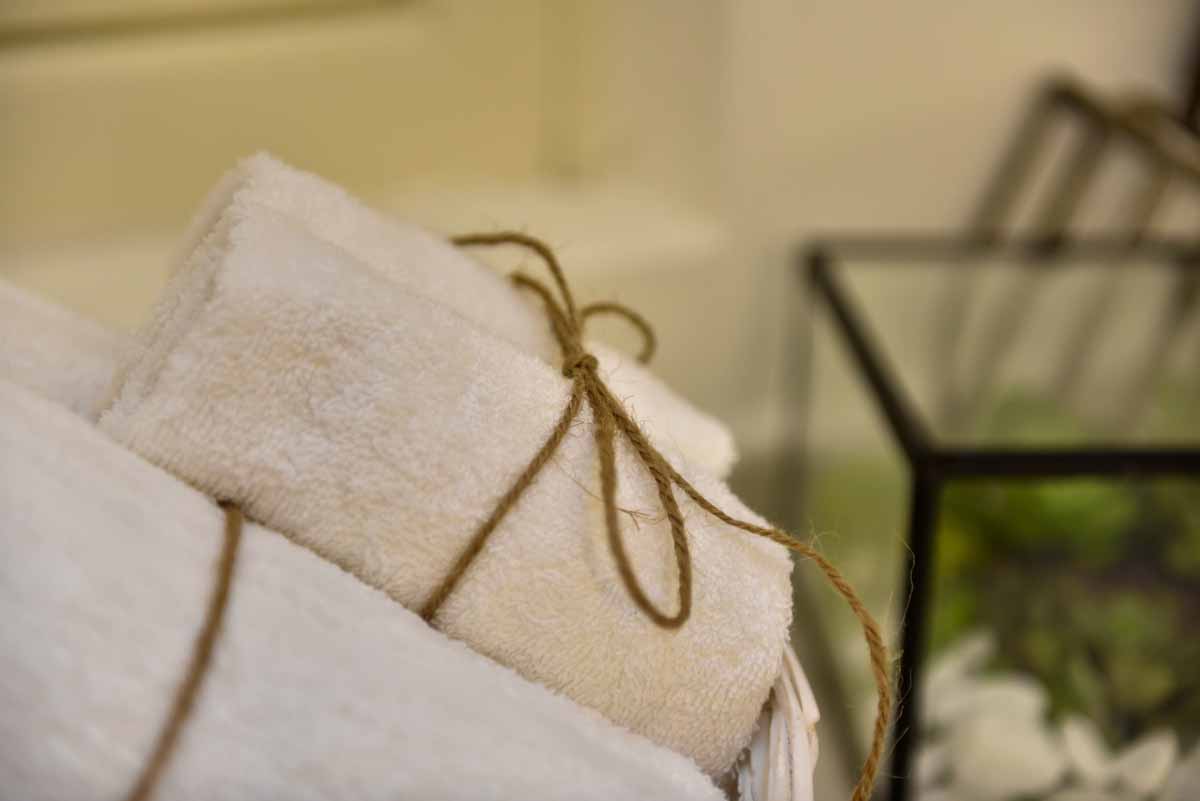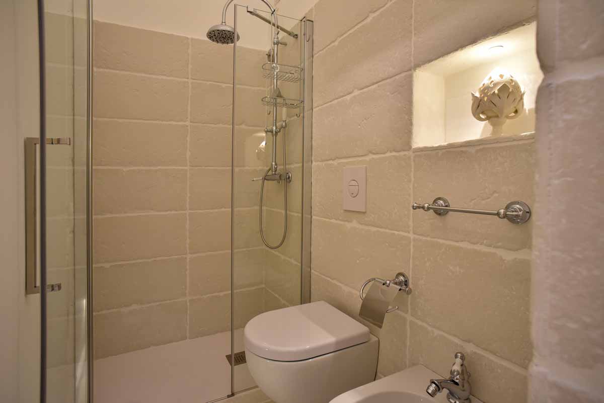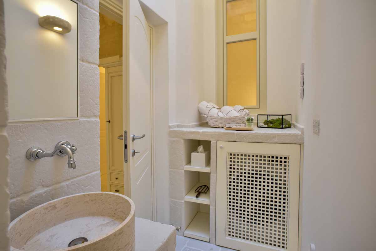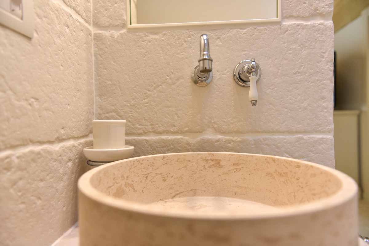 Nei colori caldi, negli arredi, nella scelta dei materiali dell’ambiente bagno si esprime lo stile autentico delle dimore di Puglia. Il lavabo in pietra, ad esempio, colpisce per lo stile ricercato ed essenziale.